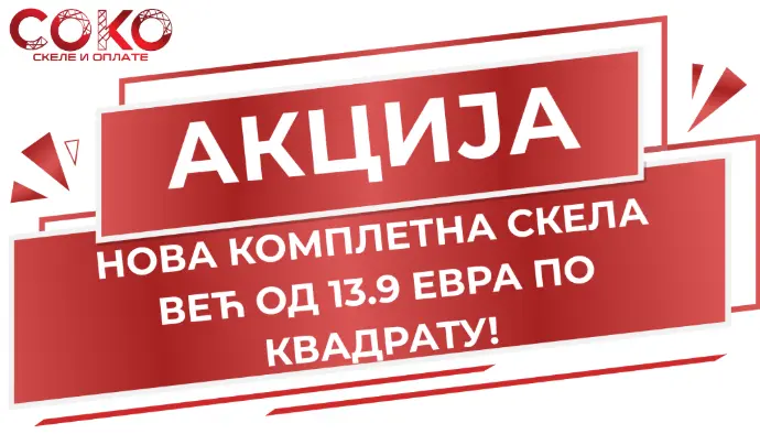 САМО ЈОШ ДАНАС! Новембарска Соко Скеле акција, пакети комплет рамовске брзомонтажне скеле са свим пратећим елементима на снижењу до 42%, већ од 13.9 евра по квадрату!